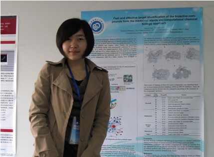 刁妍妍同学的墙报介绍了采用计算化学生物学和网络药理学的方法快速识别天然产物作用靶标的工作。如何快速锁定药用植物中的目标活性成分并确定其治疗作用靶标,是现代药物研究的一个热点领域,也是一个非常大的技术挑战。华东理工大学李洪林教授与第二军医大学张卫东教授合作,报导了利用天然产物-靶标-药理网络,针对天然降血糖药用植物假马齿苋和金边瑞香植物中主要成分开展网络药理学研究,发现了5个具有抗糖尿病并具改造前景的活性天然成分,并进行了相关药理学研究,明确了此类药用植物活性成分的作用靶标为二肽基肽酶-IV(DPP-IV)。相关论文发表在《药物化学通讯》杂志上(Med. Chem. Comm., 2011, 2(6), 471-477),该杂志在第一时间为该论文配发了评述“HOT: something old, something new – combining traditional Chinese medicine and computational chemical biology”,认为这项工作为从大量临床有效、但物质基础不清楚的传统药物中发现新的候选药物并鉴定它们的作用靶标提供了一个快速且成功率高的思路和方法。