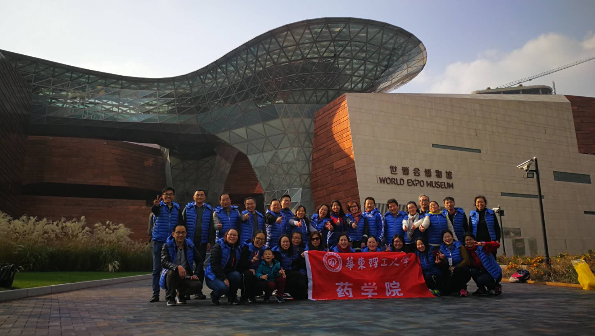 大家按照既定路线,沿龙腾大道徒步步行至上海世博会博物馆。一路上,老师们三两漫步前行,或谈天或赏江景者;有手里拿着相机,时而驻足拍照,又时而摄像;更有孤军奋力前行,不作片刻停留的健走者。正午的阳光照在长长队伍中的每一位老师身上,大家的脸上都露出幸福的欢笑。