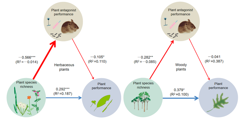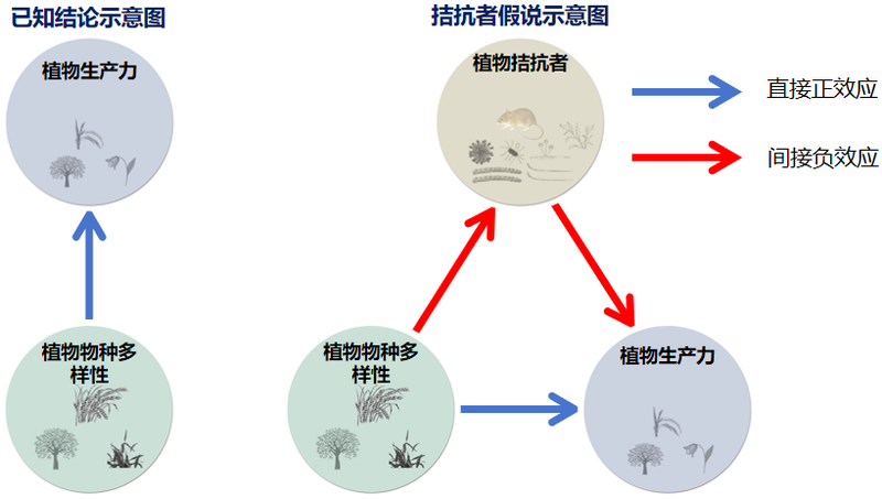 经典的“生物多样性–生态系统功能关系”理论(biodiversity–ecosystem functioning relationships)认为,增加植物多样性可直接促进植物生产力,该理论已获多篇Nature和Science正刊研究证实(如Nature, 1996, 379: 718-720;Nature, 2004, 431: 181-184;Science, 2016, 354: aaf8957),但植物多样性是否通过抑制植物病虫草鼠害等有害生物(即“植物拮抗者Plant antagonists”)间接提升植物生产力,此前仍是未解之谜。为此,万年峰课题组联合中、英、法、德、芬兰、荷兰、瑞典、瑞士、加拿大共9国18个机构科研人员,整合全球609个受控试验数据,不仅验证了传统理论,更发现植物多样性可通过抑制植物有害生物显著提升生产力,据此提出“植物拮抗者假说”(Plant antagonist hypothesis)”(图1),为理解生物多样性对生态系统的调控作用提供了新视角。
