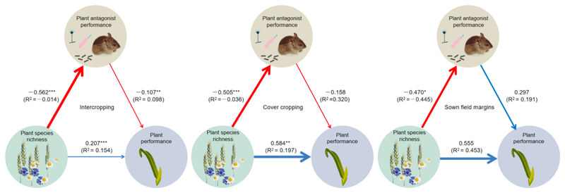 在证实农业系统中作物多样性控害能同时通过直接和间接途径增加作物生产力的基础上,作者进一步将作物多样性种植模式划分为间套作(Intercropping)、覆盖作物(Cover cropping)和田埂播种植物(Sown field margins)三类,研究发现间套作和覆盖作物对主栽作物具有显著的直接增产效应,而田埂种植植物的增产效果则不显著;同时,间套作通过抑制作物病虫害实现间接增产的效应尤为突出,而其他两种模式在控害间接增产方面的效果均不显著(图3),这说明间套作是实现作物多样性控害增产的最理想种植模式。