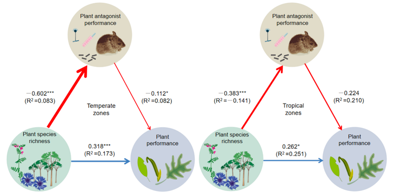 图5:温带和热带地区植物多样性控害对植物生产力的影响存在差异