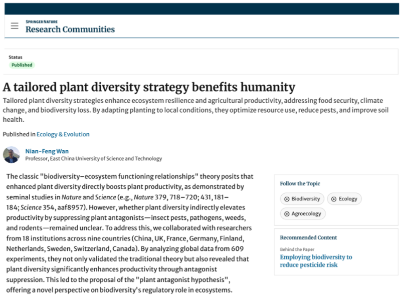 图6:万年峰在Nature Portfolio Ecology & Evolution Communities上报道利用植物多样性控害成果