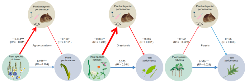 在将陆地生态系统划分为农业系统、草原与森林系统后研究发现,植物多样性在这三个系统中均能直接促进植物生产力提升,但农业系统中作物多样性通过抑制植物病虫害来增加作物产量的间接效应尤为显著,而草原和森林系统则未表现出显著的控害间接增产效果(图2)。