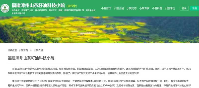 、青蛙王子集团、福建中妆技术研究有限公司共同建设的“福建漳州山茶籽油科技小院”在全国科技小院服务管理平台正式上线运行,标志着校企合作在推动山茶油产业产学研深度融合与科技赋能乡村振兴方面进入新阶段。