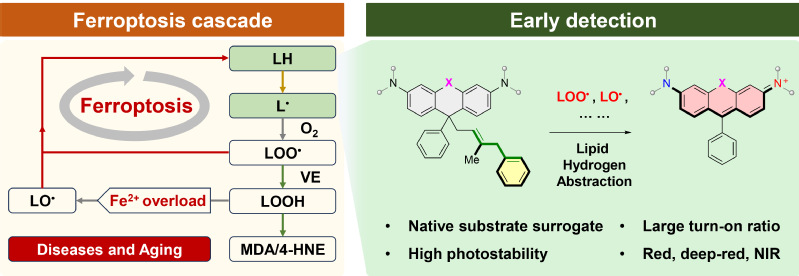 铁死亡是一种依赖于Fe²⁺和脂质过氧化的调节性细胞死亡方式,与缺血再灌注损伤、神经退行性疾病、肿瘤等多种疾病的发生发展密切相关。其生物化学核心特点在于脂质过氧化的级联反应,而脂质脱氢正是该级联反应的起始步骤,是早期检测铁死亡的理想靶点。然而,由于缺乏能够特异性识别脂质脱氢的分子工具,铁死亡的早期精准检测一直是领域内的重大挑战。